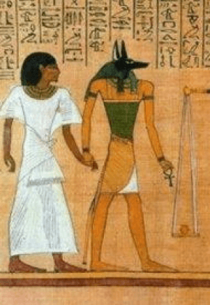 По рассказу Книги Мертвых, во время суда Осириса Анубис определяет, достоин ли человек войти загробное царство (египетский подземный мир, Дуат). Анубис кладёт на одну чашу весов царства мёртвых сердце покойного, а на другую помещается богиня правды Маат в виде страусового пера. Душу, которая окажется тяжелее пера, немедленно пожирает страшное чудовище Амат (гиппопотам женского пола, с гривой и головой крокодила и львиными лапами). Душа, которая весит легче пера, вознесётся к небесному существованию.
